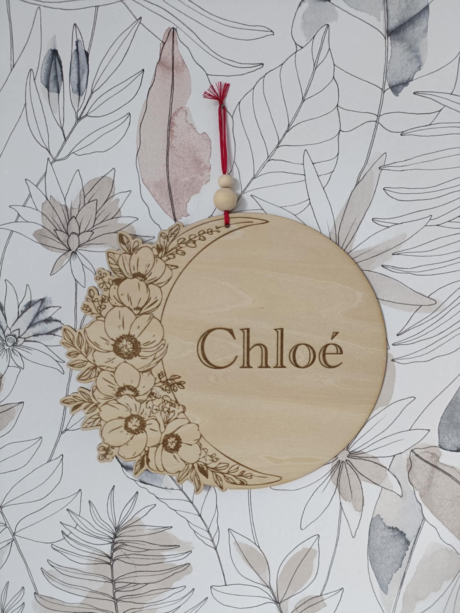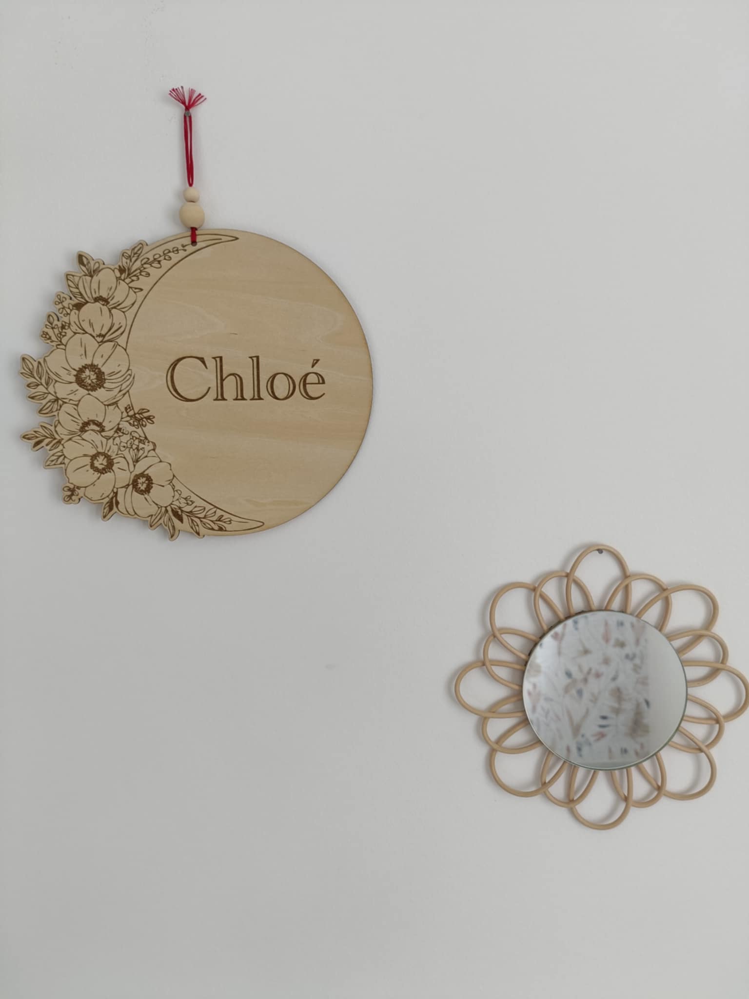 Transformez l'atmosphère dans la chambre de votre enfant avec cette pancarte ronde en bois personnalisable avec un prénom. Chaque pièce, ornée d'une lune délicate entourée de fleurs, invite à la rêverie et à la sérénité 🌙.